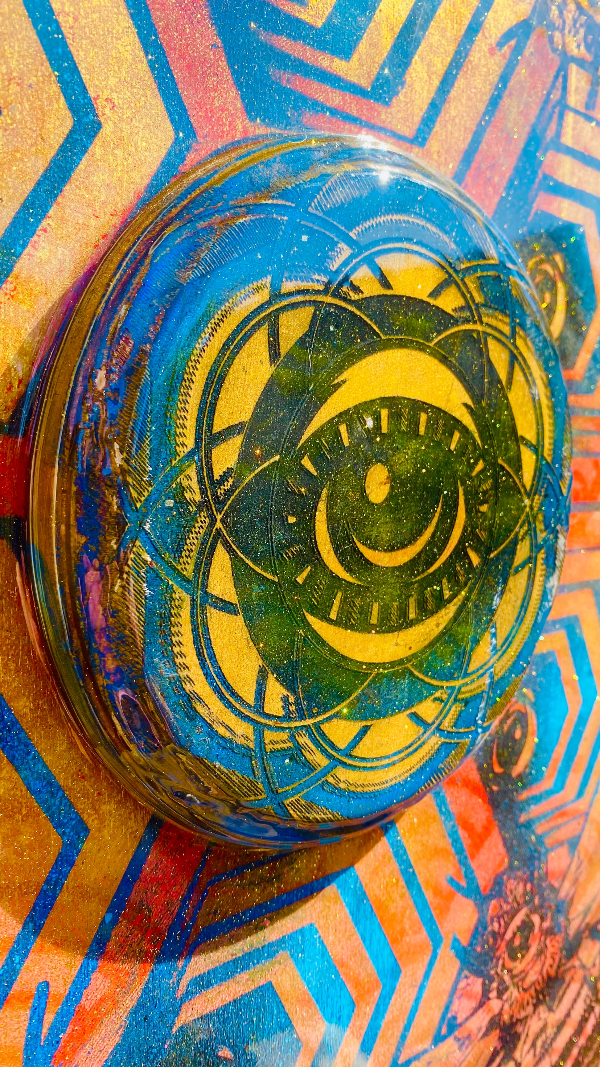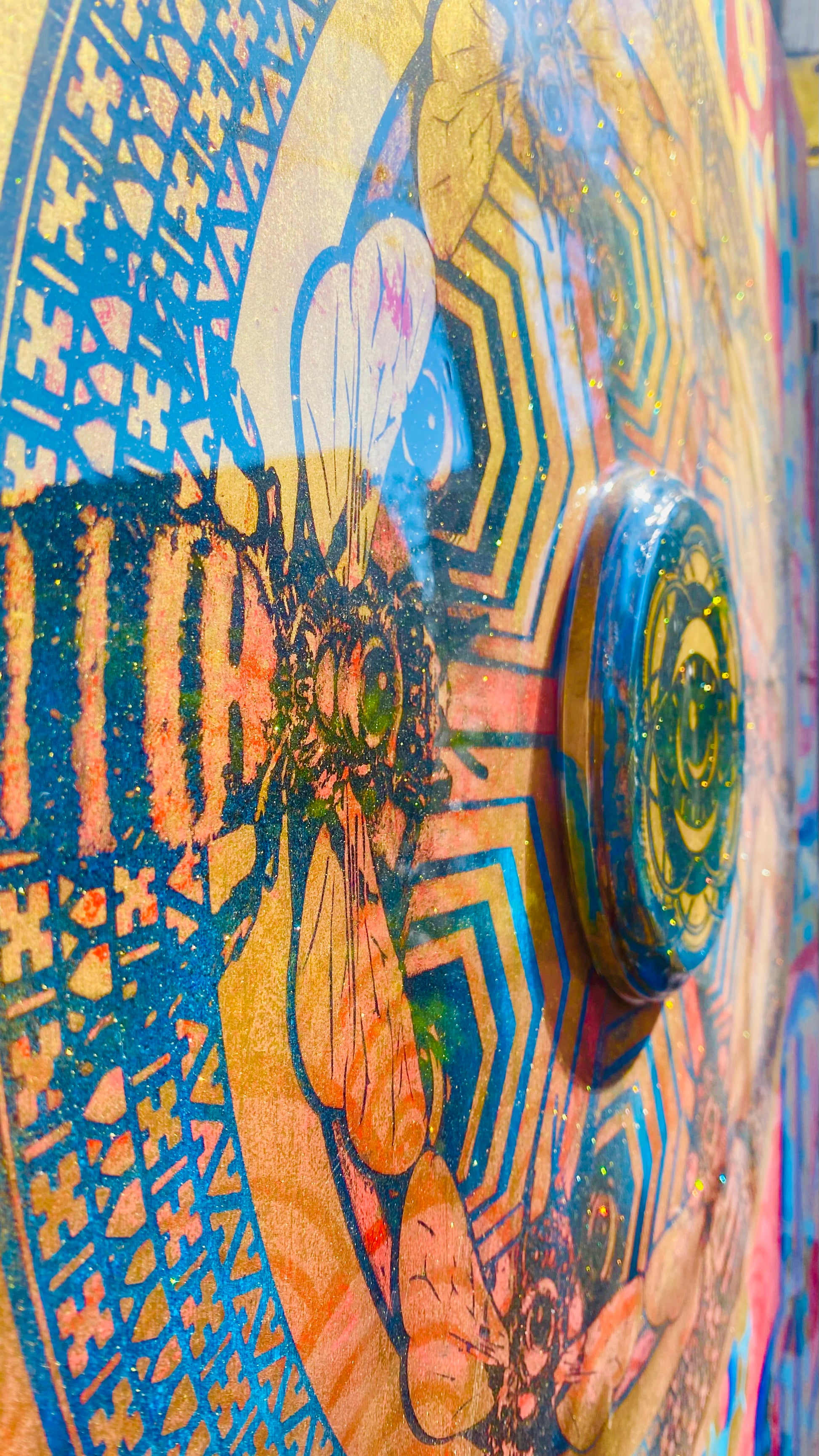 This collaboration between Peat Eyez and the talented Clark Medley (@Clark_Medley on IG) almost took a year to produce between the two artist. Peat first stenciled a pattern and then passed it to Clark who painted his iconic letters and a large Gold leafed medallion. He then returned the wood panel to Eyez where he then engraved an intricate design and also attached a wood engraved medallion. Peat then passed the piece back to Clark where he added the finishing touches and poured a super thick clear coat epoxy for maximum protection and unbeatable shine.