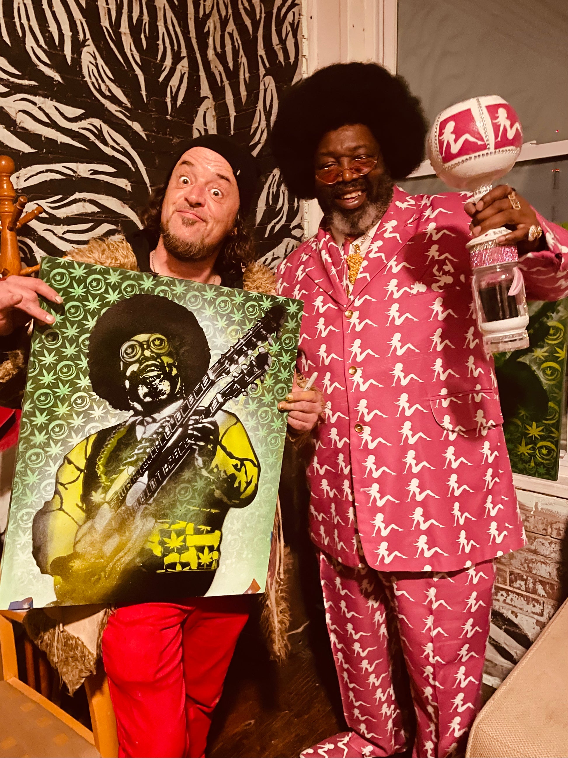 Peat Eyez brings in the Green New Year (Celebration of Recreational Cannabis in his state of Missouri) with this glow-in-dark 8x8 inch canvas painting. This was painted live by Eyez at Afroman’s NYE bash at the Broadway Boat Bar 2022…some his his last paintings of the year!