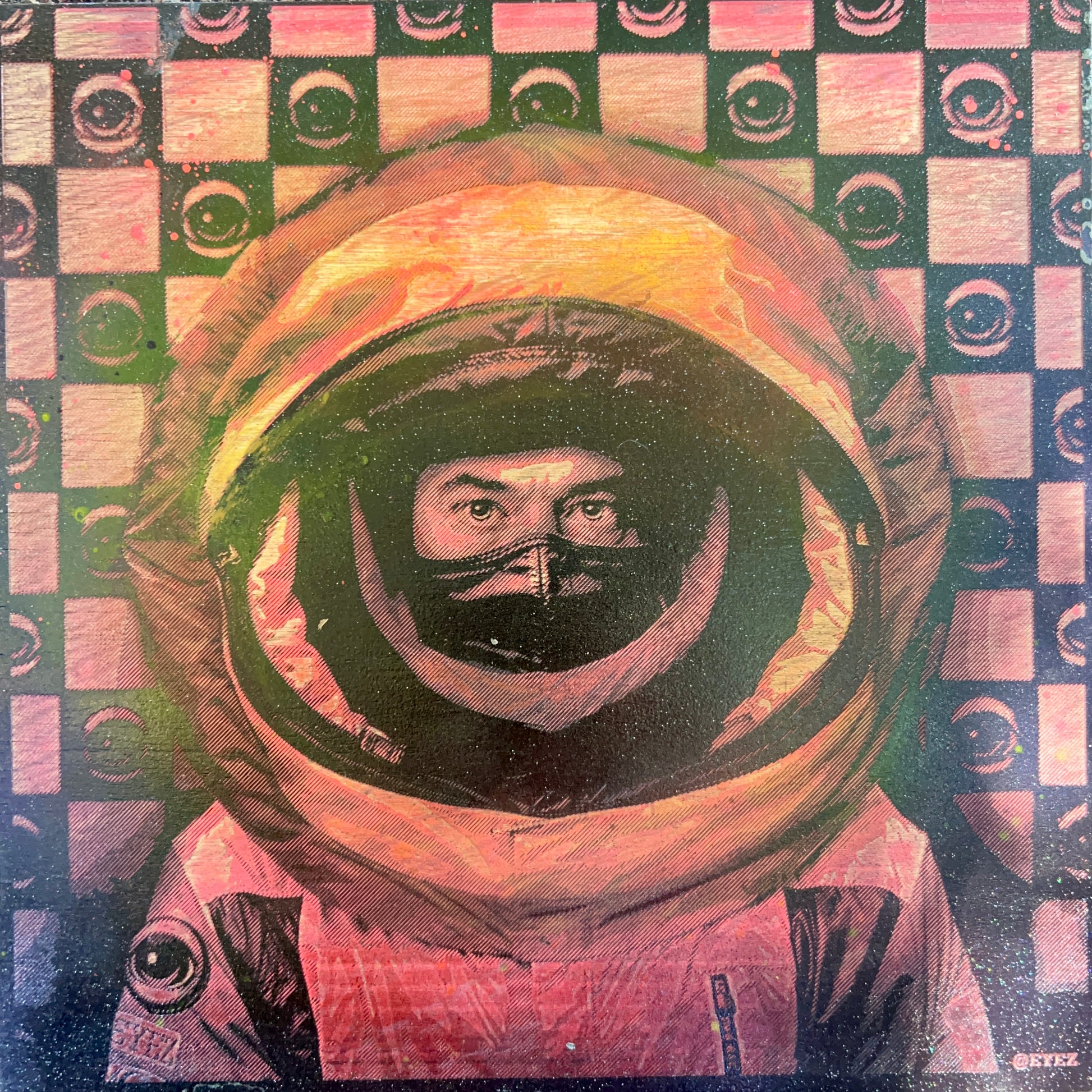 Your Eyez will Race on this wooden spray-painted 12x12 inch wood panel…look close the racer driving the car is Peat Eyez. The work utilizes UV sensitive Paint for a unique visual appeal that glows under a black light!
