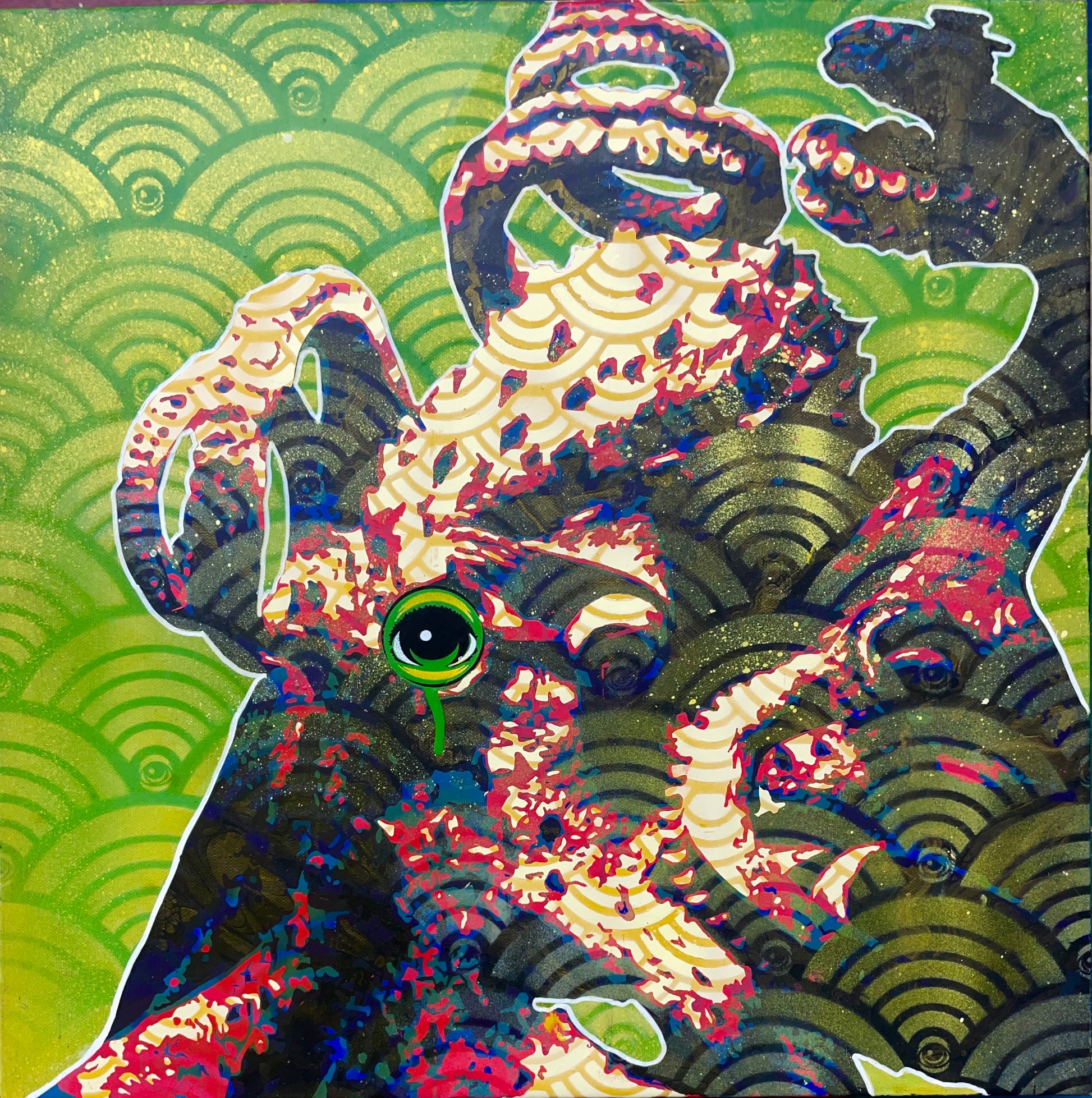 @Eyez Collaboration with stencil artist Lucient trapArt. They met the day Lucient moved in to Happen Space and connected immediately as Stencil Brothers. This piece also traveled to St. Louis when Lucient was there painting live and they continued the collab there and then finished it when Peat came back to Chicago for the 2023 exhibit.