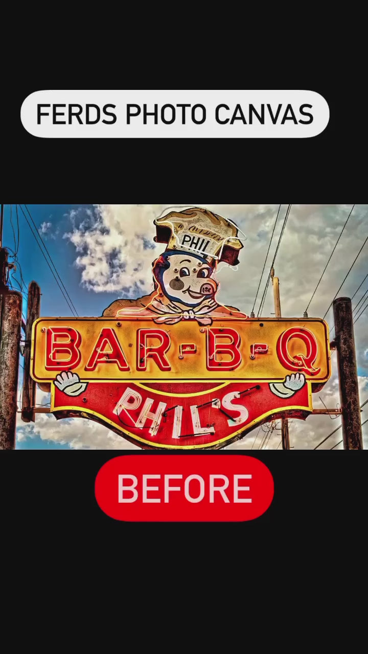 @Eyez Collaboration with Robert Ferd Frank from the 2023 C👁LLAB👁RATE series. 24x36 gallery wrapped photo print remixed by Eyez with stencils and Spraypaint. It used to be a photo of Phil’s BBQ sign from Ferds 2012 series.