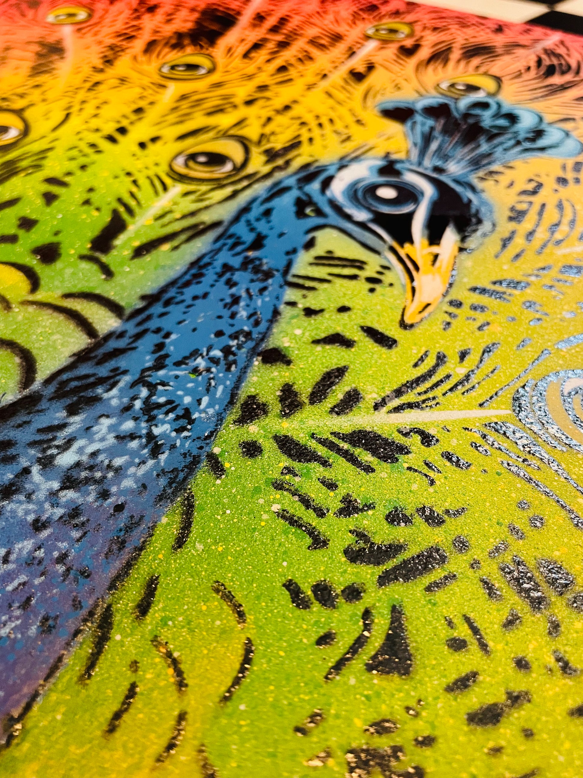 Eyez spirt animal is the Peacock 🦚 even tho he does not have tattoos he struts usually in very bright colors just like the Male Peacock, and is his inspiration for this Painting. This painting is on 18x24 inch wood cradled panel. This is also based off of his mural that he painted in Wynwood during Art Basel 2021.