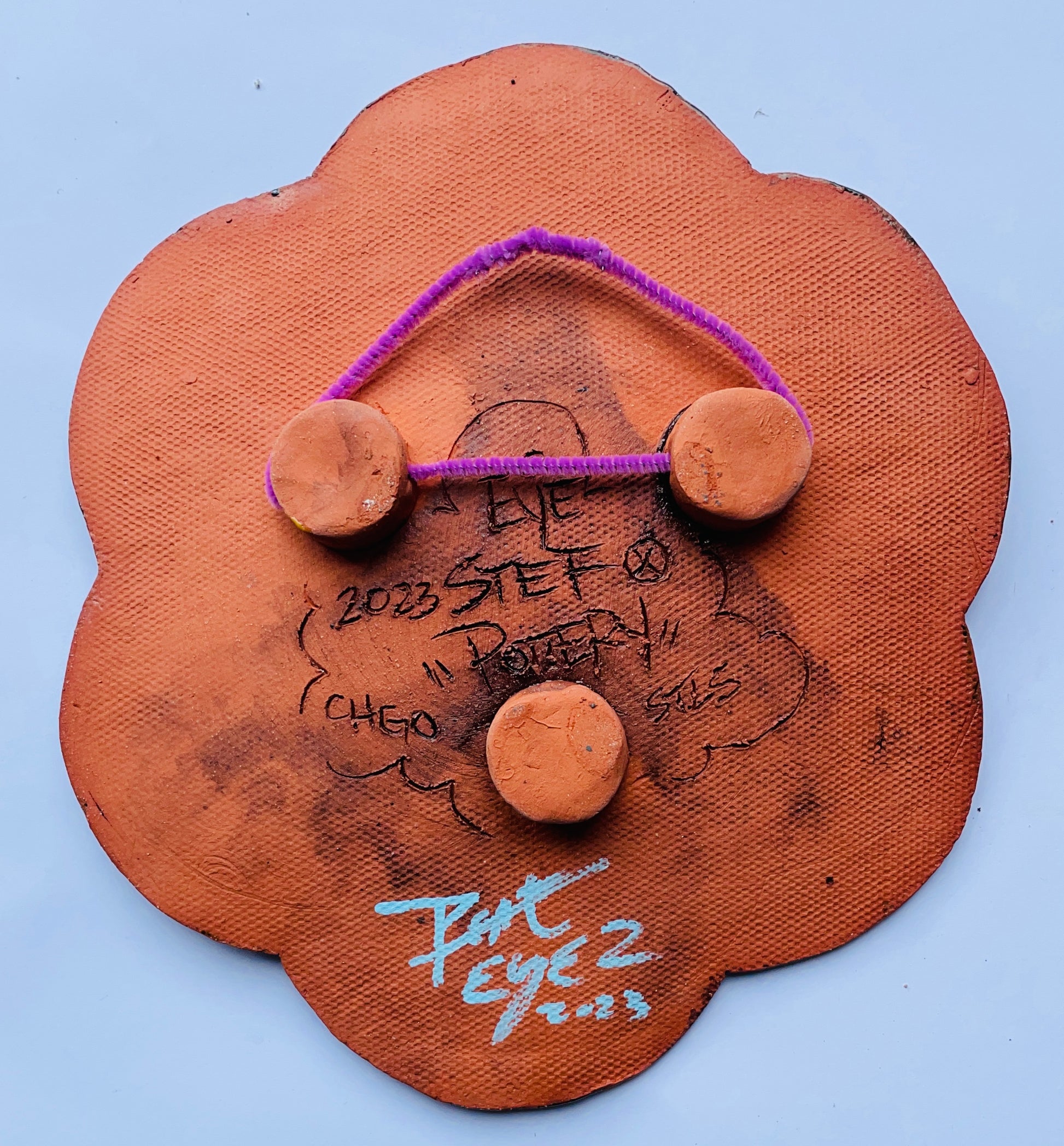 @Eyez Collaboration with XMEN Queen Stef Skills on a clay medium where she asked him to make a stamp with his Laser. She sent him a sketch then he eyed it up and did a 5 hour engraving on plexi and then traveled to Chicago to deliver it to her. She then pressed the image in to clay and hand-painted glaze on and the fired the piece to create a one of a kind collabs for the Chicago Exhibit.